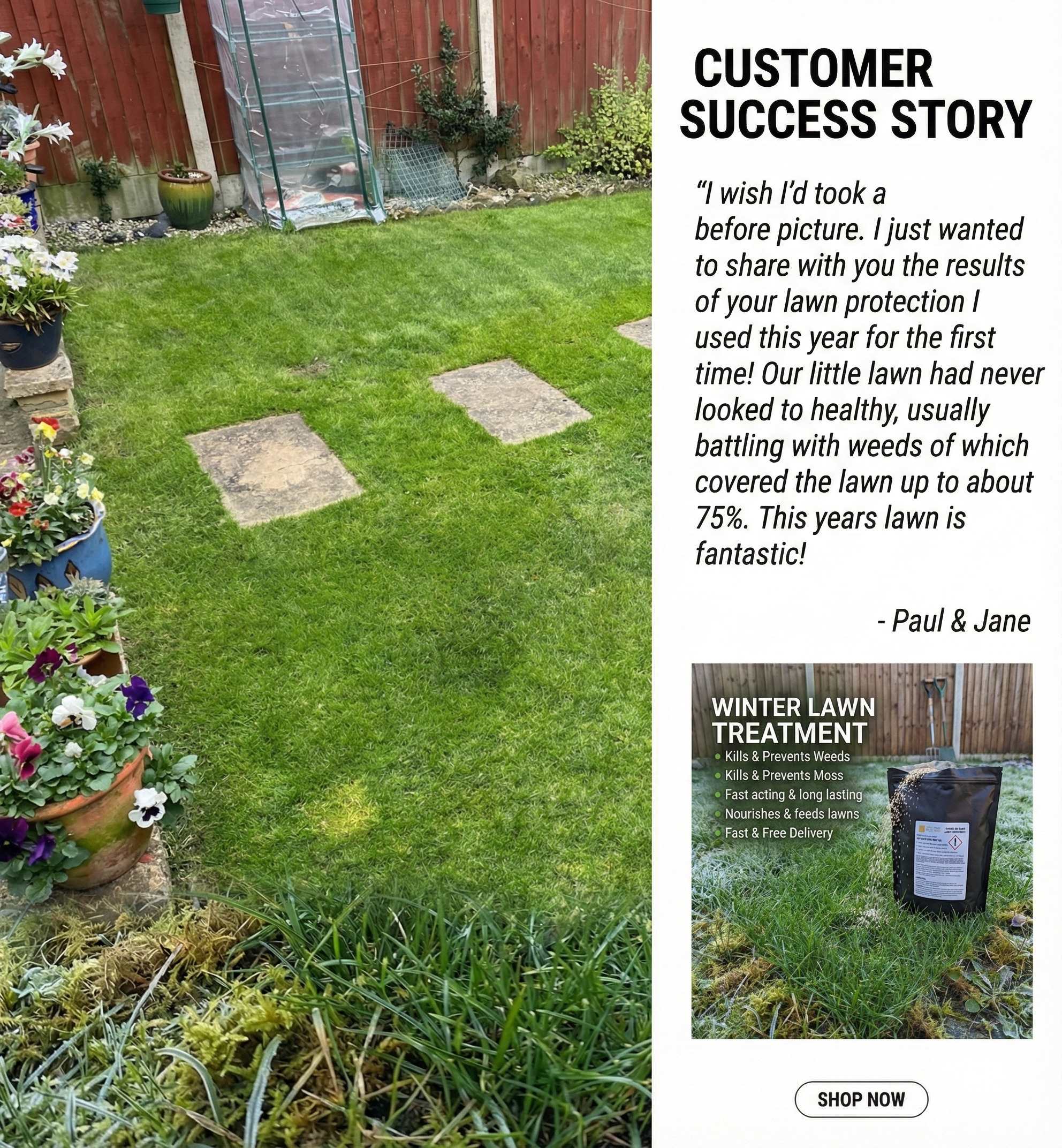My grass was looking yellow and sad, but this brought it back to life. The weeds are dying back and the colour has returned. Great product for winter maintenance